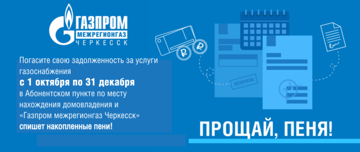 С 1 октября по 31 декабря 2025 года для жителей Карачаево-Черкесской Республики пройдет акция «Газпром межрегионгаз Черкесск» - «Погаси долг без уплаты пени».